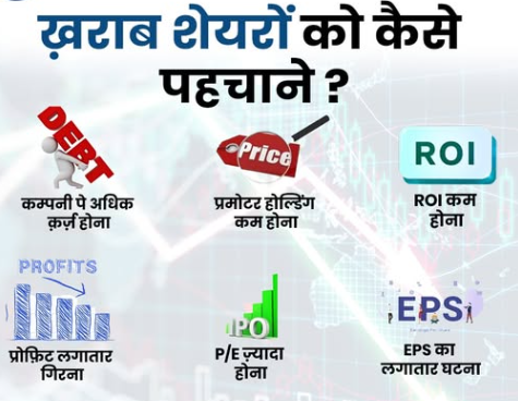 खराब शेयरों (Bad Stocks) की पहचान करने के लिए आपको कंपनी के वित्तीय आंकड़ों, प्रबंधन और बाजार के रुझानों का विश्लेषण करना चाहिए। यहाँ कुछ प्रमुख संकेत (Red Flags) दिए गए हैं जो एक खराब शेयर की ओर इशारा करते हैं: